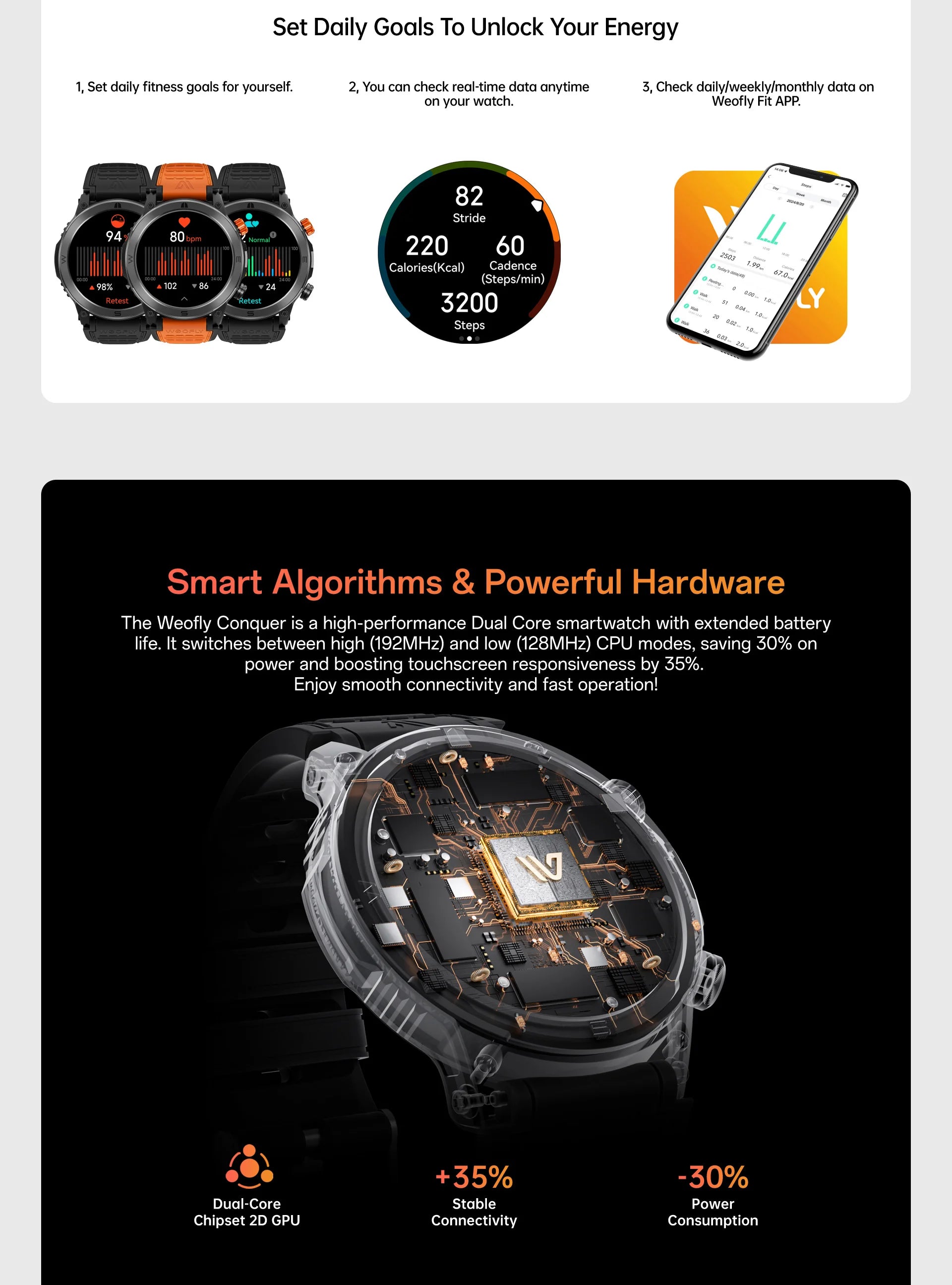 تُعد ساعة Weofly Conquer الخيار الأمثل لمن يبحث عن الأداء الجبار والتصميم الفاخر. بفضل معالجها ثنائي النواة وشاشة الـ AMOLED المذهلة، توفر لك الساعة تجربة استخدام سلسة واستجابة فورية، مع نظام تتبع صحي متطور يبقيك على اطلاع دائم بحالتك البدنية.